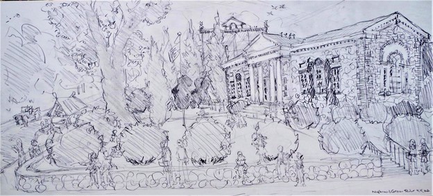 Last saw Jon, and other friends, us hanging out on the Cherry Street wall at the library; spring 1964. That remained memorable. I drew it in 2021, for those trying to preserve and repurpose the 1913 library and trees.